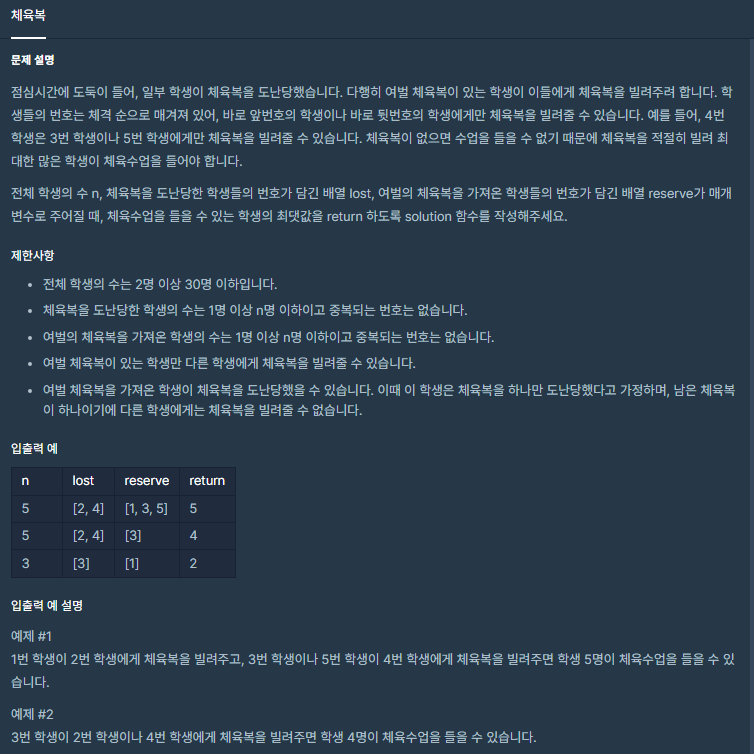그리드 함수를 쓰는 체육복 문제이다. 난이도는 1이며,