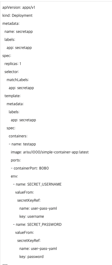 위와 같이 env하위에 이름과, valueFrom, secretKeyRef를 작성하면, 해당 시크릿에서 값들을 가져온다.