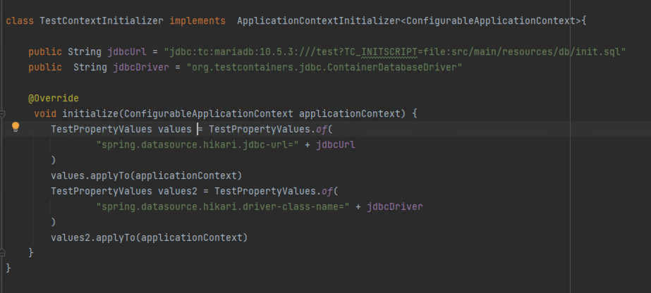 그래서 컨테이너 생성 이후에, 테스트 빏드시, datasource에서 사용하는, 몇개의 빈을 override해주어야