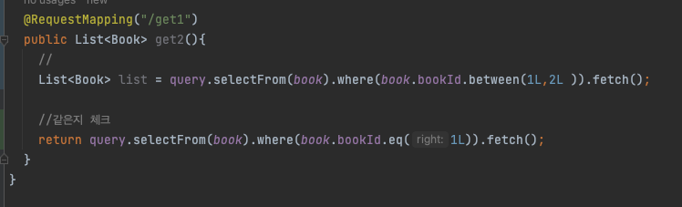 List<Book> list = query.selectFrom(QBook.book).where(QBook.book.bookId.between(1L,2L )).fetch();