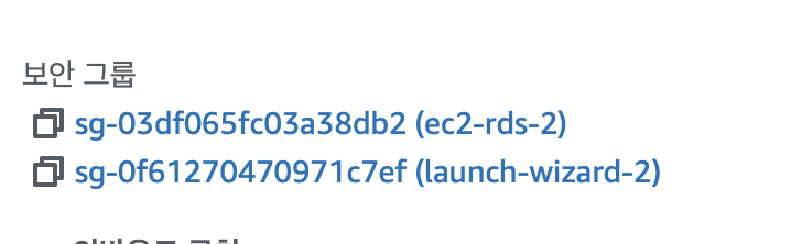 못보던 보안 그룹이 생성됬다. (ec2-rds-2) 이거말고도 비슷하게 디비 포트에 대한 방화벽 오픈을 해주었는데...