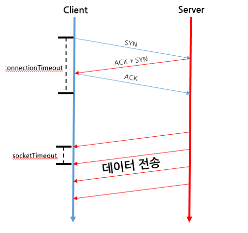 소켓타임마웃은 클라이언트에서 서버에 대한 Connection에 대한 데이터를 받는 것 까지의 Timeout을 의미한다.