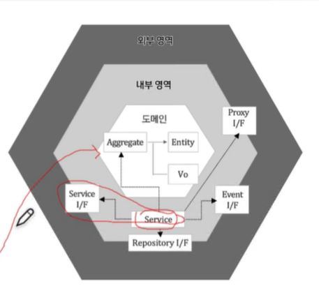서비스는 필요시에 비즈니스 도메인인 Aggregate를 호출하고 이는 엔티티나 VO를 호출하게된다.