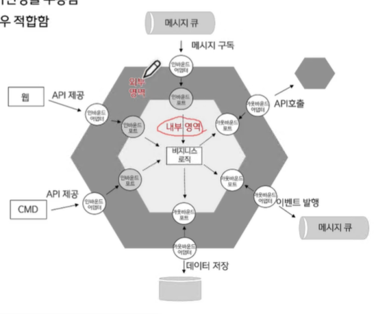 원리는 헥사고날과 비슷하다. 가변적인 영역을 외부에 놓고, 비즈니스 로직을 내부에 놓는다.
