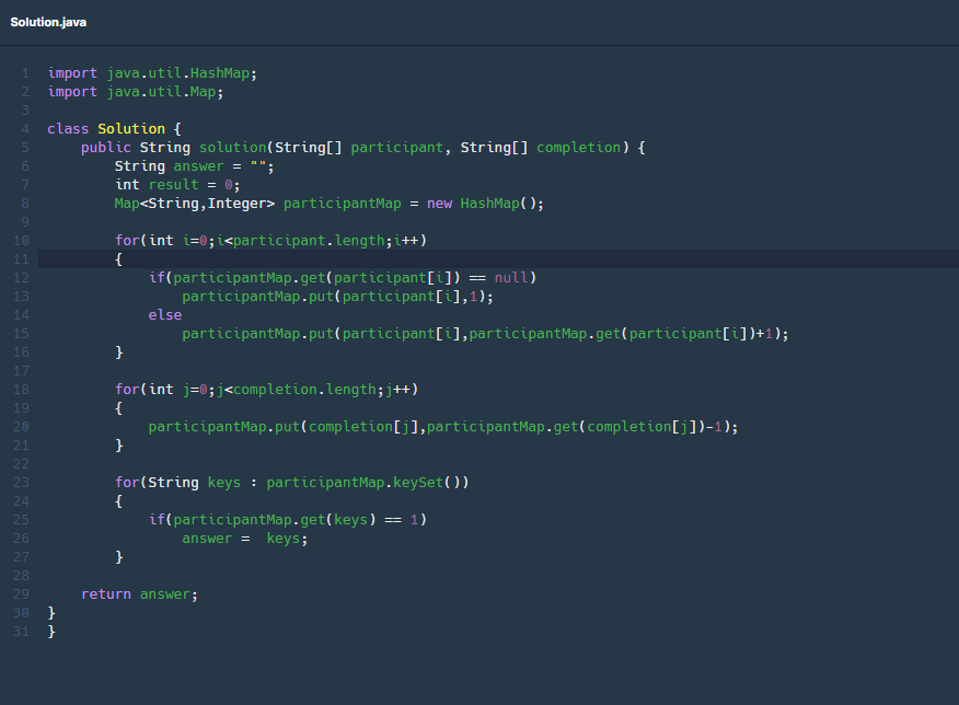 마라톤에 참여한 선수들의 이름이 담긴 배열 participant와 완주한 선수들의 이름이 담긴 배열 completion이 주어질 때, 완주하지 못한 선수의 이름을 return 하도록 solution 함수를 작성해주세요.