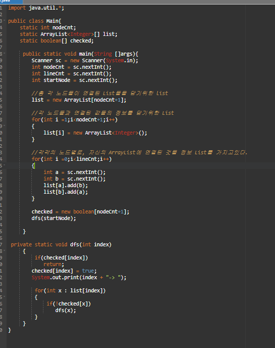 dfs함수 분리, 동일하게 ArrayList[] 생성 및 각 노드별 ArrayList 생성