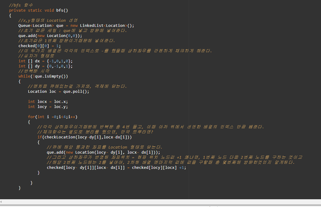 반복문은, 처음에 poll해서 Queue에 있는 걸 가져와서, x,y좌표를 상하좌우를 체크를 해준다.