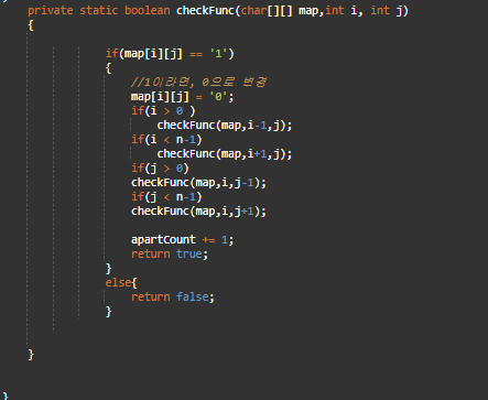 총 바꾼 값을 count 로 추가하게 된다. 이게 한가지 단지를 0으로 바꿔주고, 단지 개수를 구하는 방법이다.