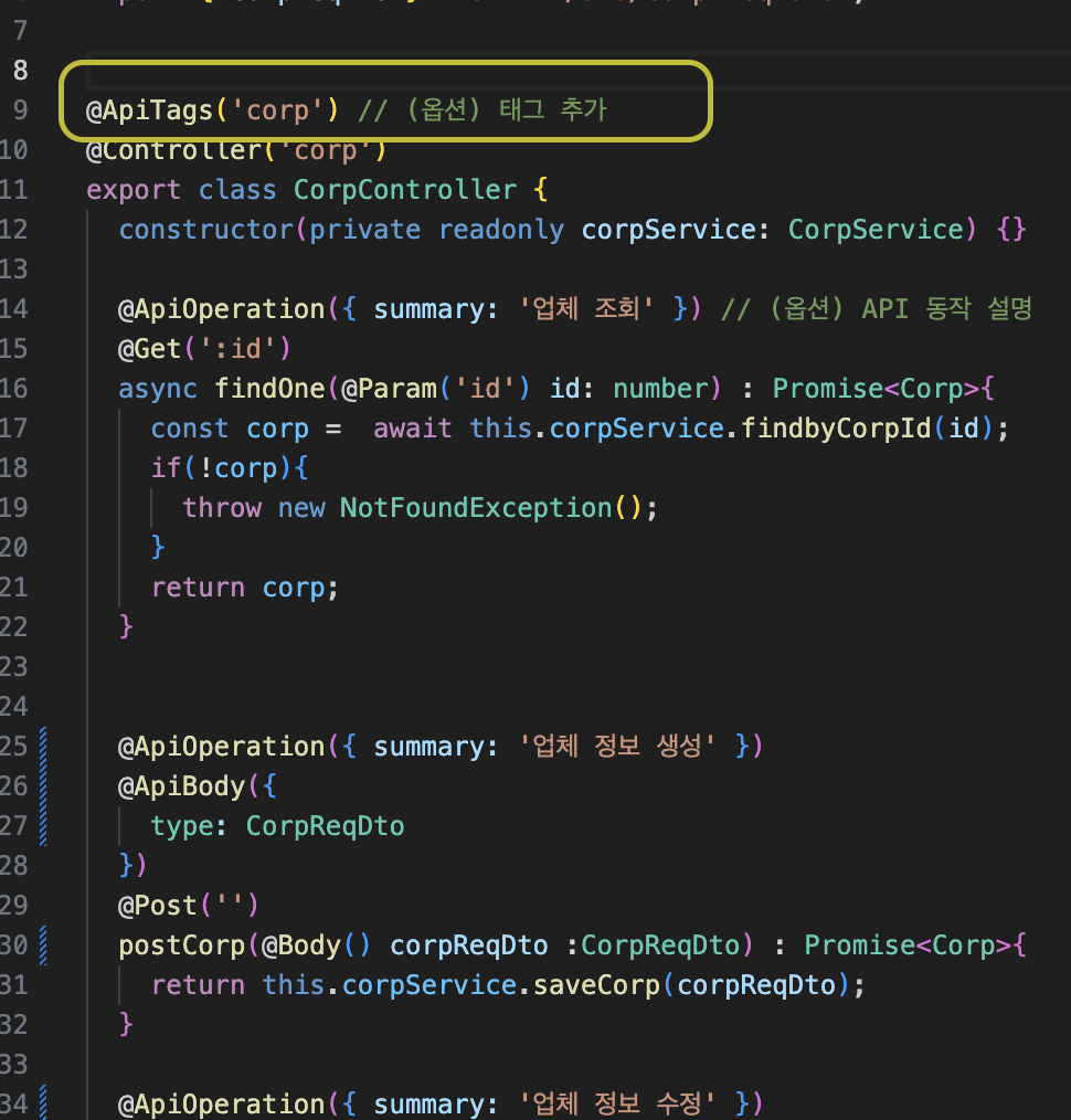 1) ApiTags : 컨트롤러 단위로 태깅을 해서 그룹핑이 가능하다.
