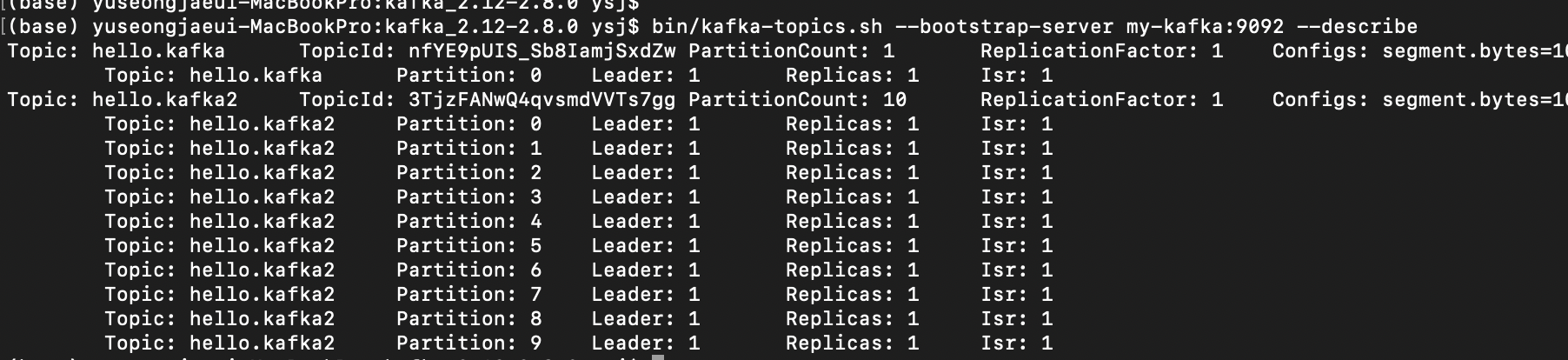 bin/kafka-topics.sh --bootstrap-server my-kafka:9092 --topic hello.kafka --describe