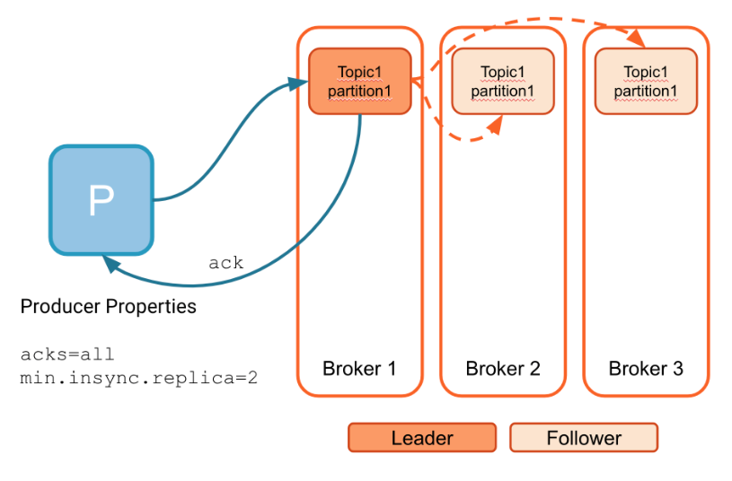 acks=all은, 하나의 ISR 팔로워가 프로듀서의 데이터를 잘 복제 했다는 것을 알려주는것을 의미하고