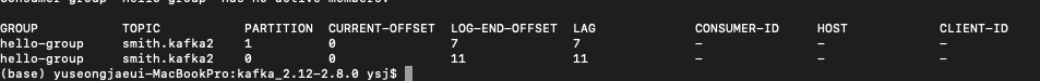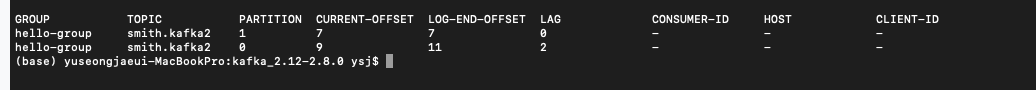 그리고 상태와 오프셋 컨슈머 렉 컨슈머 ID,호스트 등을 알 수 있다.