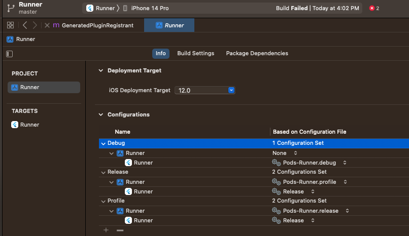 Runner.xcodeproj 열고 Configuations의 환경을 아래와 같이 Pods-Runner.xxx로 변경