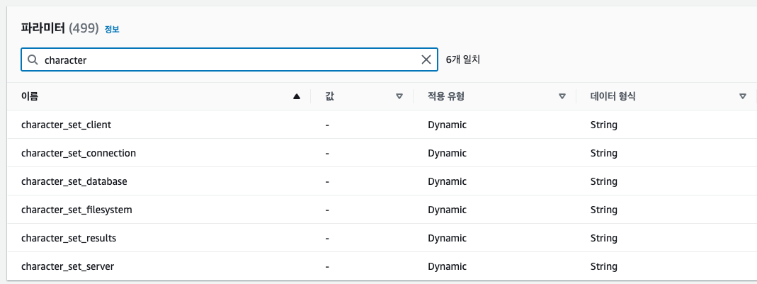 파라미터 검색창에 [character]을 입력하여 검색되는 아래 6개의 값을 [utf8]로 변경 후 [변경 사항 저장]을 누른다.