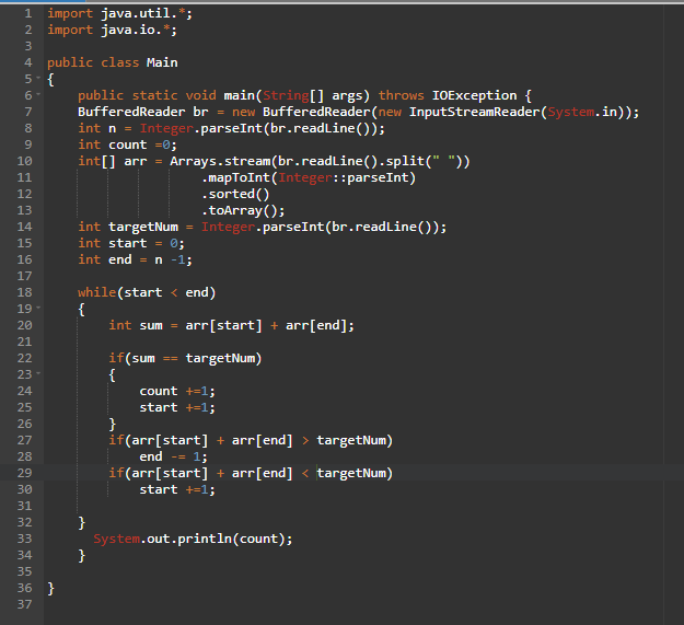 그냥 맨처음과 끝을 투포인터로 두고, 합한걸, 비교해서 작으면 start를 올리고 크면 end를 줄인다.