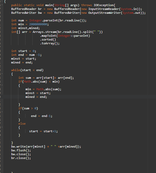 첫째 줄에는 전체 용액의 수 N이 입력된다. N은 2 이상 100,000 이하이다. 둘째 줄에는 용액의 특성값을 나타내는 N개의 정수가 빈칸을 사이에 두고 주어진다. 이 수들은 모두 -1,000,000,000 이상 1,000,00
