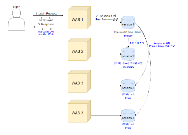 그림과 같이 Primary서버는 Secondary 서버에 세션객체의 key value전체를 복제한다.