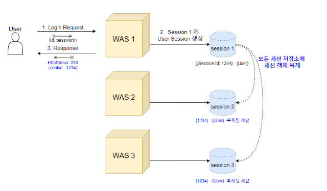 all to all 세션 복제란 하나의 세션 저장소에 변경되는 요소가 발생하면 변경된 사항이 다른 모든 세션에