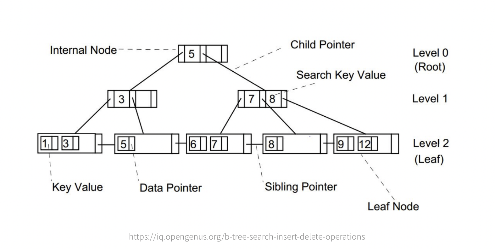 leaf node에서는 실제 데이터 값만 가지고있고, 위의 논리 노드에서는 자식 노드에 대한 위치만 포인터로 가지고있게 된다.