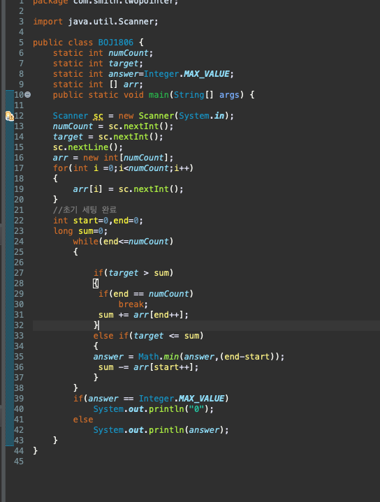 left,right로, 단순 카운트가아니라, 정답에 부합할때 (주어진 합보다 이상인 경우) 일때, math.min으로 구하는것