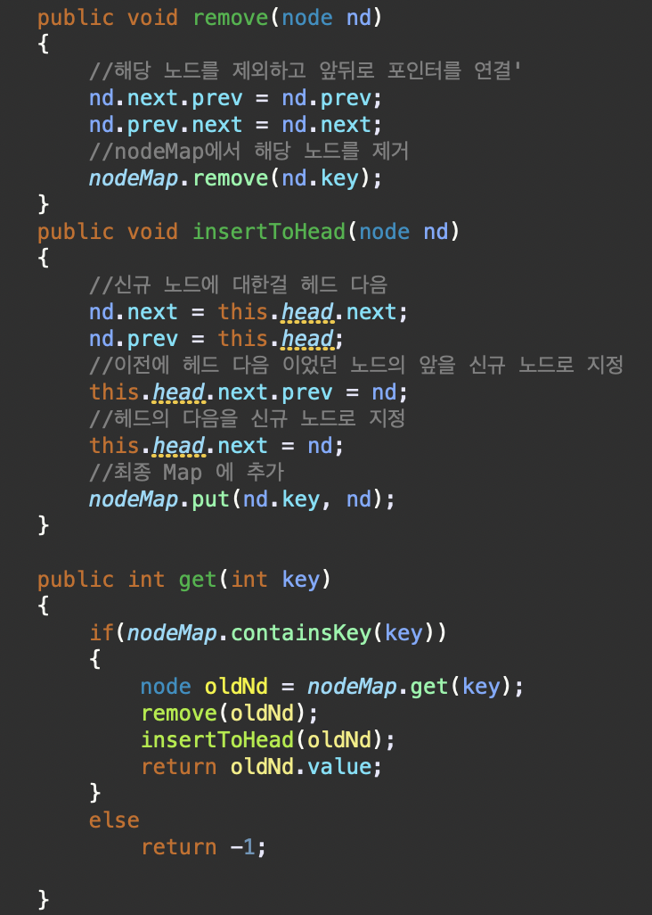 remove(다른 함수에서 사용하는 유틸함수이다. 우선 사용되면 Map에서 삭제 + 링크드 리스트에서 해당 참조를 뺀다.)