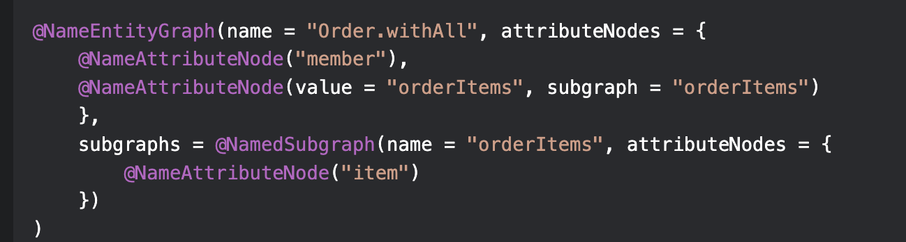 엔티티 그래프 : 엔티티 조회시점에 연관된 엔티티들을 함께 조회하는 기능