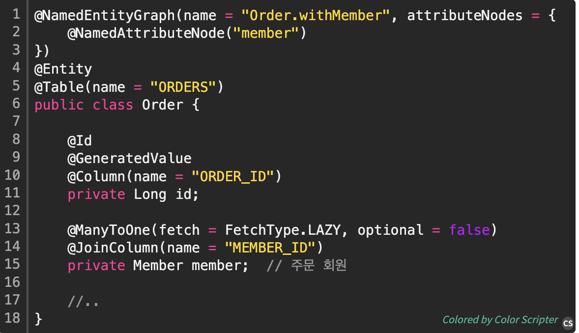 해당 같은 케이스 때, Order을 조회하면, member를 엔티티 그래프에 정의하였기 때문에