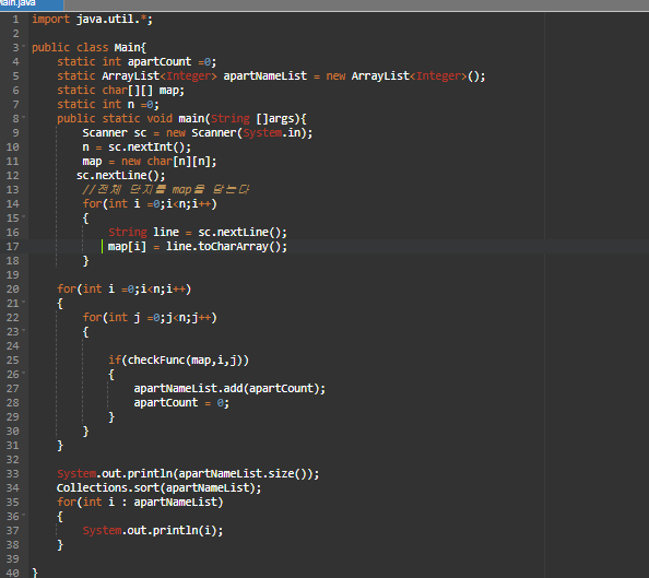 총 바꾼 값을 count 로 추가하게 된다. 이게 한가지 단지를 0으로 바꿔주고, 단지 개수를 구하는 방법이다.