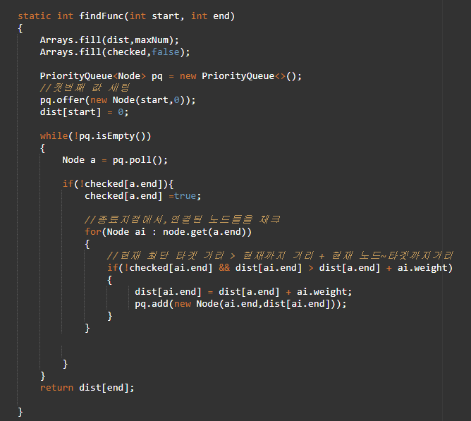 함수에서 전달 받은 시작점에 대한 setting 을 해준다 (거리 0 세팅) 그리고 우선 순위 큐에 offer해준다.
